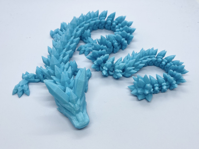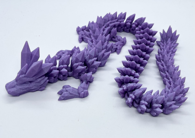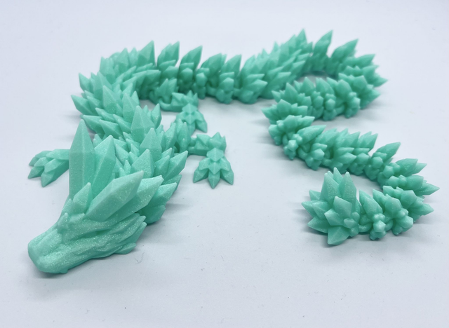 Tämä kristallilohikäärme on tulostettu glitterpintaisesta filamentista, joka heijastaa valoa kauniisti.