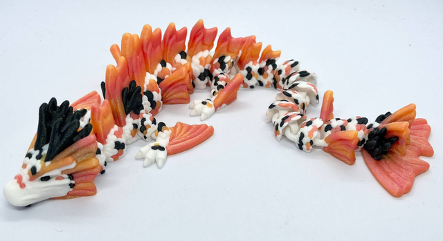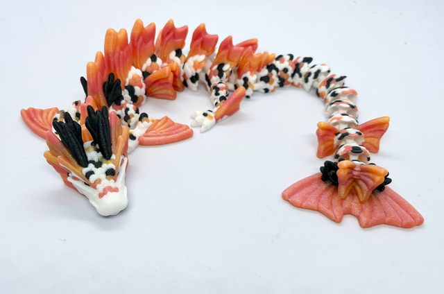 3D-tulostettu nivelletty pitkä lohikäärme fidget-leluksi. Värisävyt voivat poiketa kuvista. Valmistettu PLA-muovista.