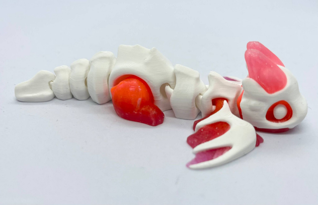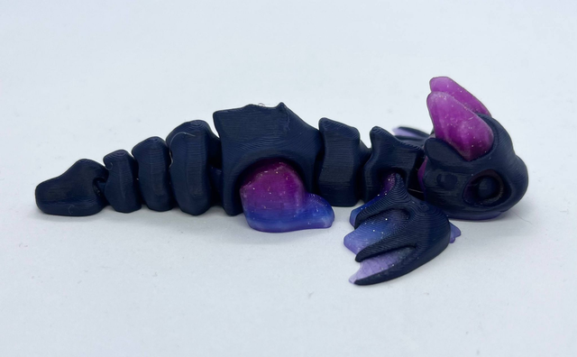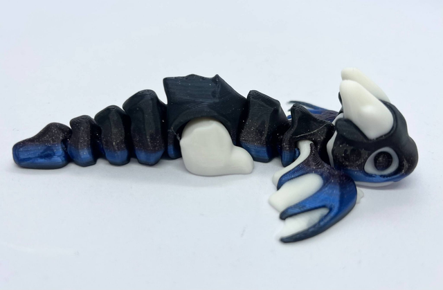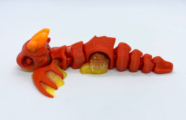 3D-tulostettu nivelletty pikkulohikäärme fidget-leluksi. Värisävyt voivat poiketa kuvista. Valmistettu PLA-muovista.