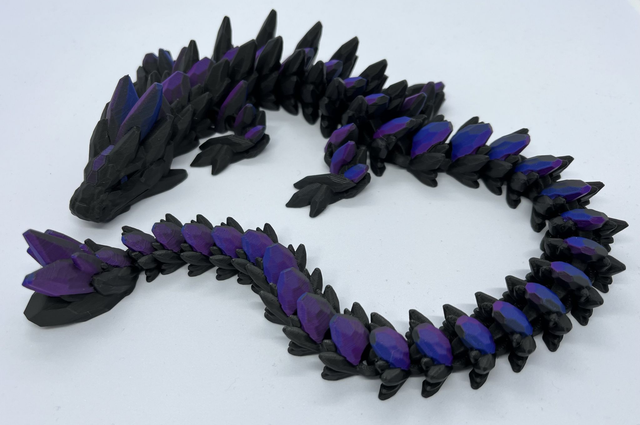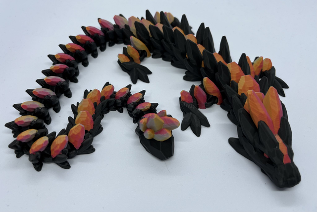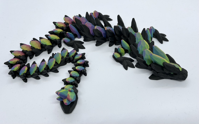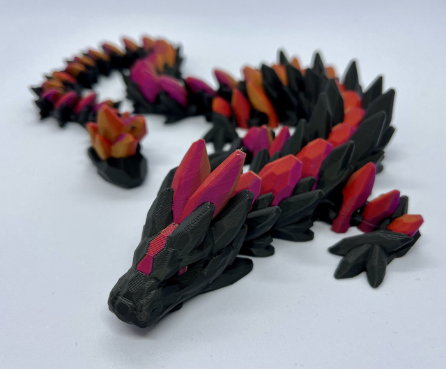 Tämän Gemstone Dragonin pohjaväri on musta, ja selkäkivet ja muut pienet yksityiskohdat on tulostettu monivärisellä mattafilamentilla.