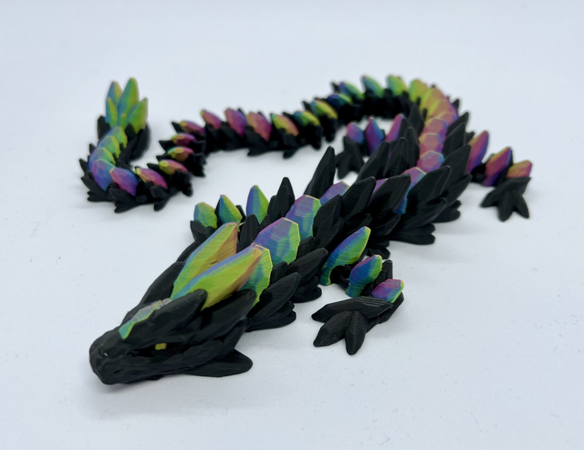 3D-tulostettu nivelletty pitkä lohikäärme fidget-leluksi. Värisävyt voivat poiketa kuvista. Valmistettu PLA-muovista.