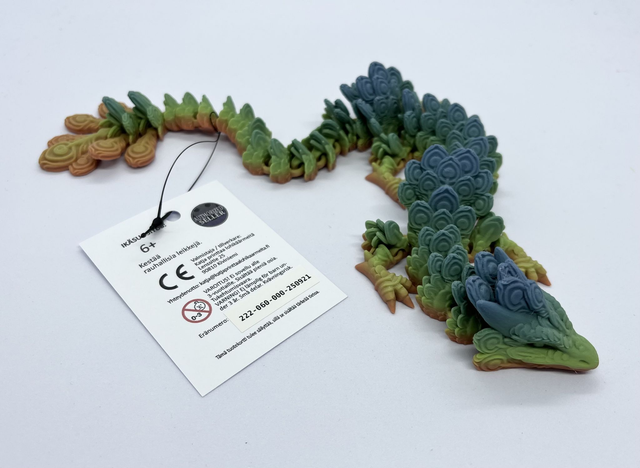 3D-tulostettu nivelletty pikkulohikäärme fidget-leluksi. Värisävyt voivat poiketa kuvista. Valmistettu PLA-muovista.