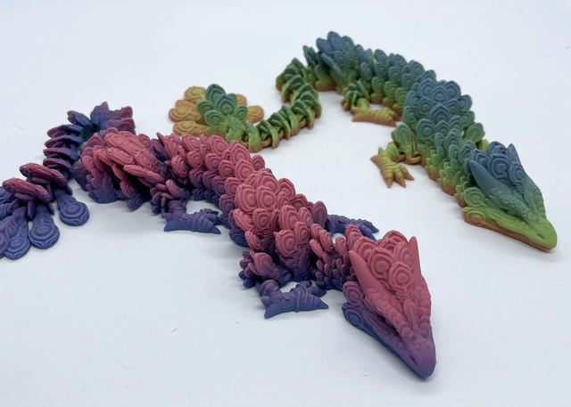 Riikinkukkolohikäärme on printattu sateenkaarenvärisestä liukuvärifilamentista. Yhdessä lohikäärmeessä on noin kolmea väriä. Väritystä ei voi valita. Tilauksen viestikenttään voi kuitenkin jättää toiveen värimaailmasta. Pyrin toteuttamaan toiveet varastotilanteen sallimissa rajoissa.