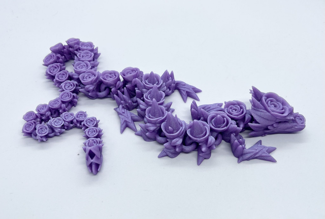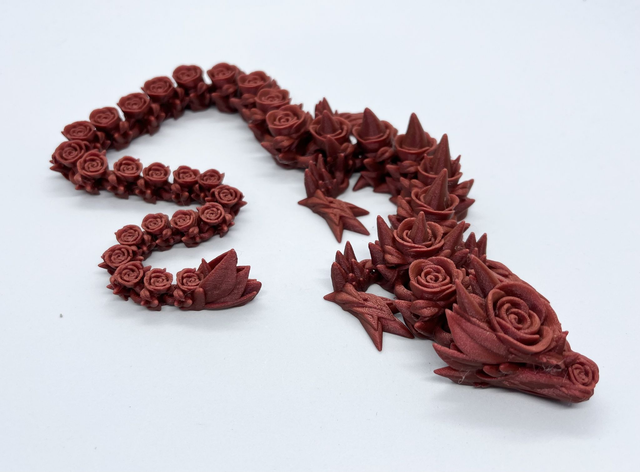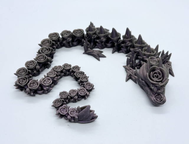 Tämä ruusulohikäärme on tulostettu glitterpintaisesta filamentista, joka heijastaa valoa kauniisti.