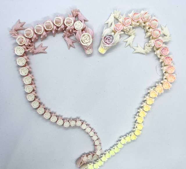 Ystävänpäivän ruusulohikäärmeestä on kaksi värivaihtoehtoa: glittervaaleanpunainen glittervalkoisilla ruusuilla, sekä glittervalkoinen silkkisen kiiltävillä pastellisateenkaariruusuilla. Silkkifilamentti on perusluonteeltaan haurasta, mutta lohikäärmeen kaikki kantavat rakenteet on valmistettu kestävästä glitterfilamentista, joten kumpikin värivariantti kestää hieman varomattomampaakin käsittelemistä.