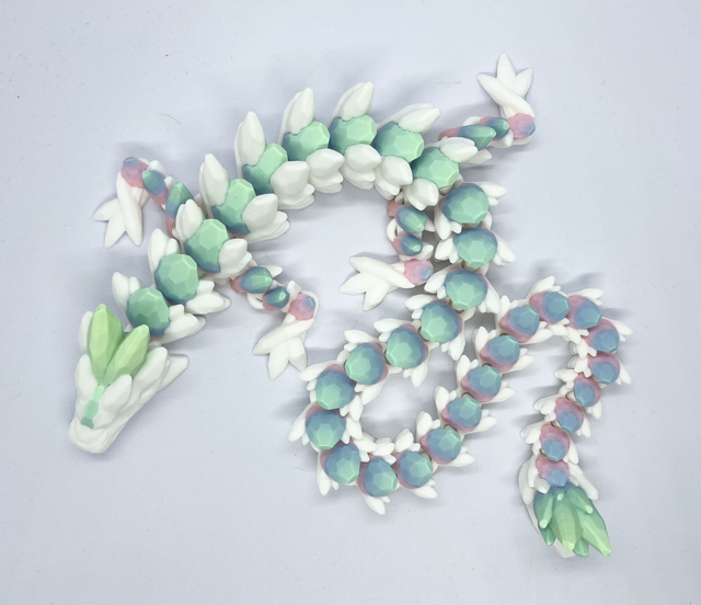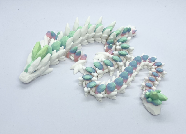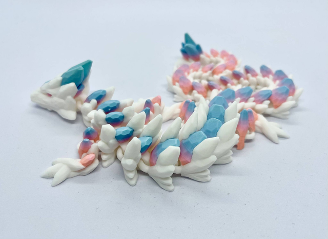 Tämän Gemstone Dragonin pohjaväri on valkoinen, ja selkäkivet ja muut pienet yksityiskohdat on tulostettu monivärisellä mattafilamentilla.