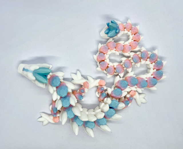 3D-tulostettu nivelletty pitkä lohikäärme fidget-leluksi. Värisävyt voivat poiketa kuvista. Valmistettu PLA-muovista.